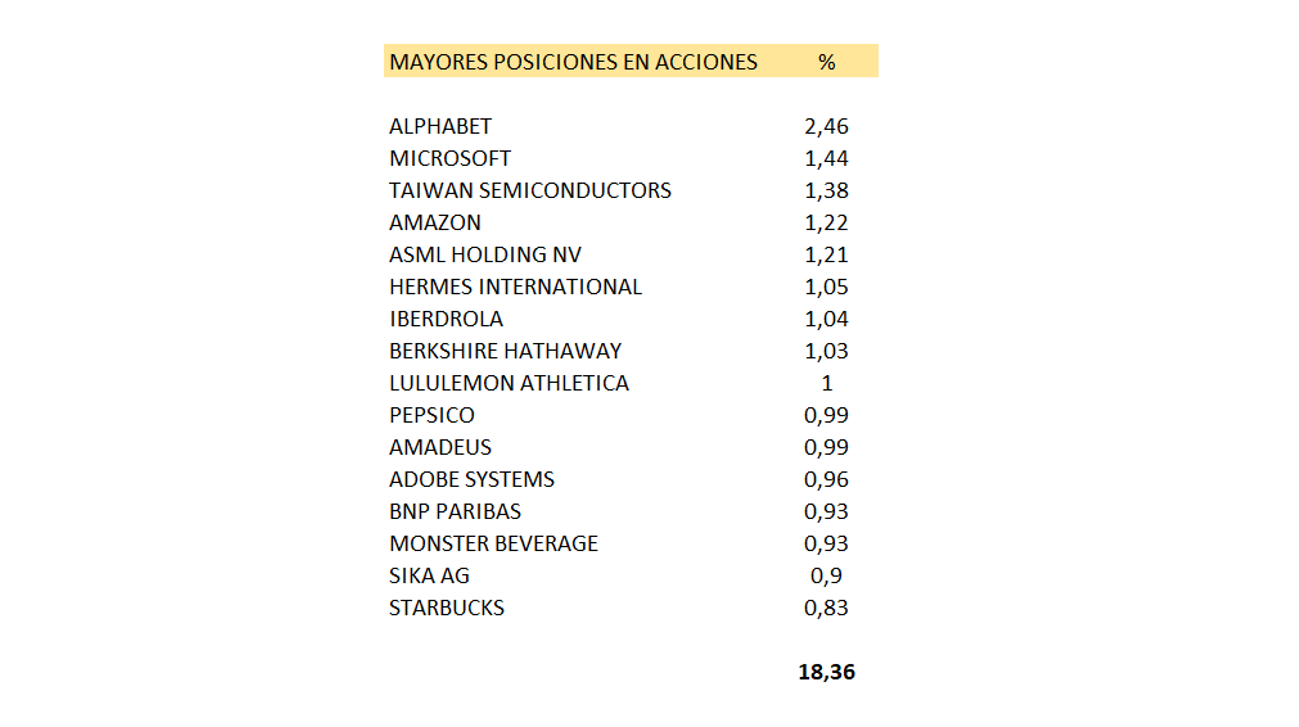 La rentabilidad del mes se ha visto especialmente beneficiada por el comportamiento de algunas de nuestras principales posiciones como Alphabet, Hermes International y Starbucks. En el lado negativo, compañías como Monster Beverage, Comcast y Warner Bros Discovery han lastrado parcialmente el resultado